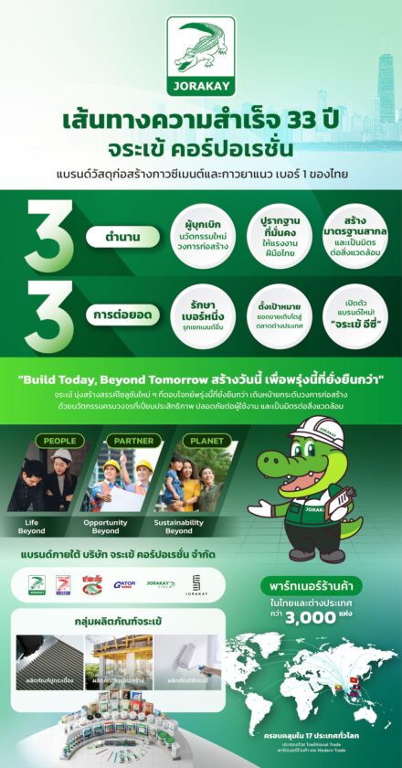 จระเข้ คอร์ปอเรชั่น ก้าวสู่ปีที่ 33 ด้วยตำแหน่งผู้นำตลาดกาวซีเมนต์และกาวยาแนวอันดับ 1 ของไทย พร้อมสร้างปรากฏการณ์ใหม่ในอุตสาหกรรมก่อสร้างด้วยแนวคิด “Build Today, Beyond Tomorrow” ที่ไม่เพียงตอบโจทย์ปัจจุบัน แต่ยังวางรากฐานสู่อนาคตที่ยั่งยืน เป้าหมายคือการยกระดับจากแบรนด์ไทยสู่ Global Brand ด้วย 3 ปัจจัยความสำเร็จ และ 3 กลยุทธ์ต่อยอดสู่อนาคต