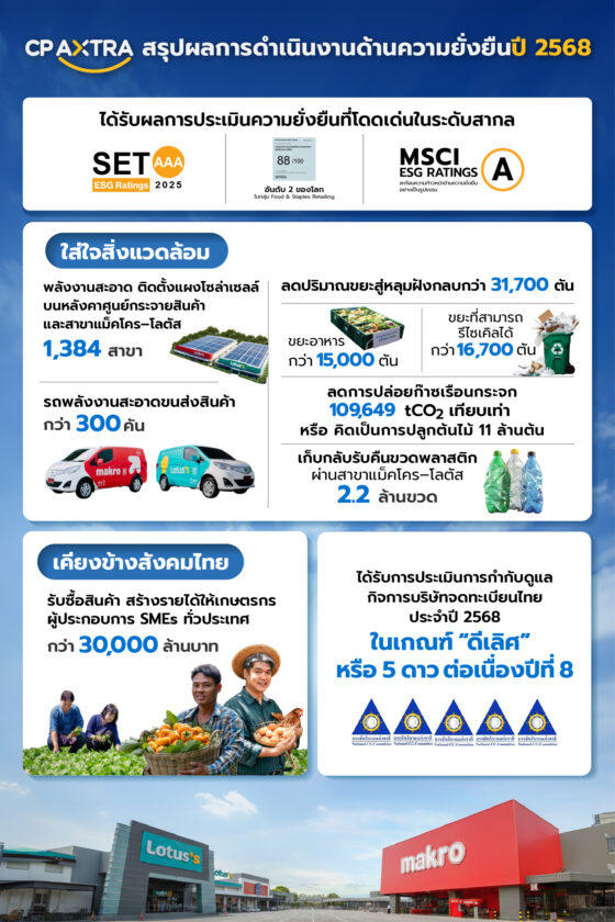 CP AXTRA ตอกย้ำบทบาทผู้นำด้านธุรกิจค้าส่งค้าปลีกอย่างยั่งยืน (Sustainable Retail Business) ของประเทศไทย หลังผลการดำเนินงานด้าน ESG ปี 2568 ได้รับการยอมรับในระดับสากล สะท้อนศักยภาพองค์กรที่สามารถขับเคลื่อนความยั่งยืนควบคู่การเติบโตทางธุรกิจได้อย่างเป็นรูปธรรม
