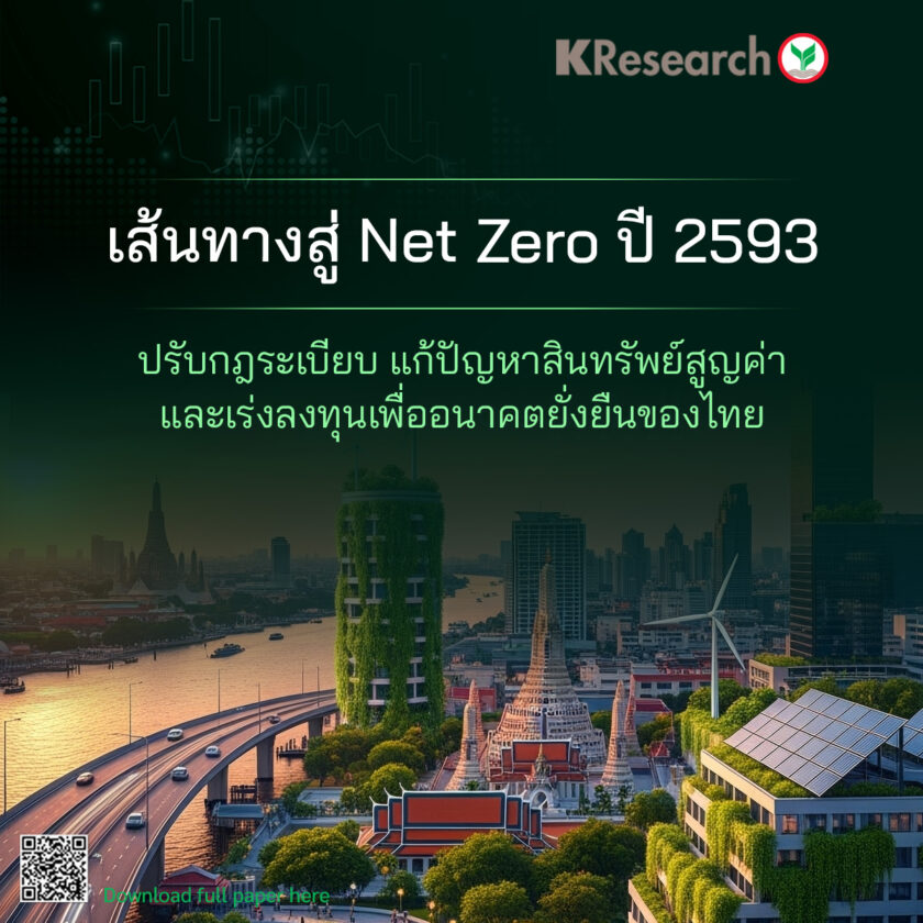 รัฐบาลประกาศปรับเป้าหมาย Net Zero ของประเทศไทยให้เร็วขึ้น 15 ปี เหลือปี 2593 ตั้งเป้าลดการปล่อยก๊าซเรือนกระจก 370 ล้านตันต่อปี “ศูนย์วิจัยกสิกรไทย” ชี้ ความสำเร็จขึ้นอยู่กับ 3 ปัจจัยหลัก — กฎหมาย กำกับสินทรัพย์สูญค่า และเงินทุนกว่า 1.28 ล้านล้านบาทต่อปี