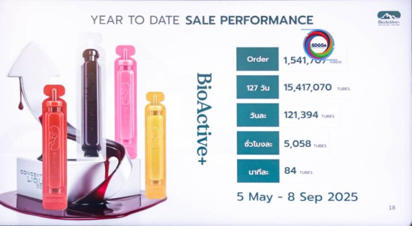 ดร.วาสนา อินทะแสง ผู้ก่อตั้ง บริษัท ไบโอแอคทีฟ เอ็นแซต 1984 จำกัด กล่าวว่า เพียง 4 เดือนหลังเปิดตัว (5 พ.ค. – 9 ก.ย. 2568) “BioActive+” ทำยอดขายพุ่งทะลุ 921 ล้านบาท จากออร์เดอร์กว่า 1.54 ล้านกล่อง หรือมากกว่า 15 ล้านหลอด คิดเป็นวันละ 121,394 หลอด ชั่วโมงละ 5,058 หลอด และนาทีละ 84 หลอด