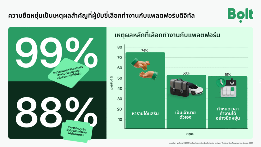 ผลสำรวจจากโบลท์ (Bolt) และ Kantar Insights Thailand เผยภาพใหม่ของ “อาชีพขับรถผ่านแพลตฟอร์มดิจิทัล” ที่สะท้อนความหลากหลาย ยืดหยุ่น และมีคุณค่าในสังคมไทยยุคปัจจุบัน