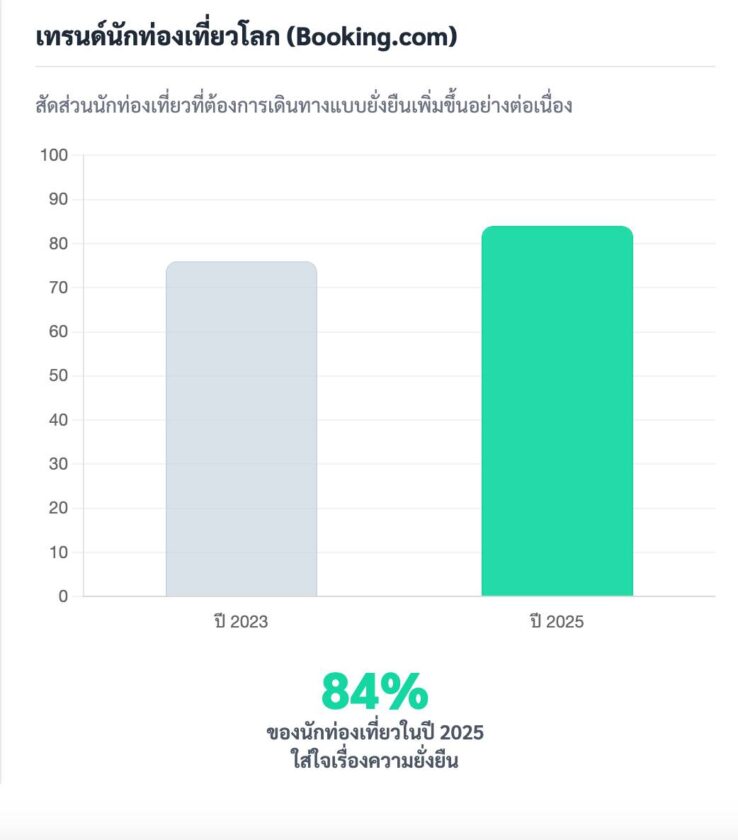 ข้อมูลจากรายงานของ Booking.com ปี 2025 ระบุว่า นักท่องเที่ยวทั่วโลกกว่า 84% ต้องการบริการที่ยั่งยืน เพิ่มขึ้นจาก 76% ในปี 2023