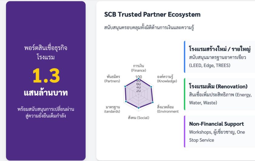 สำหรับโรงแรมที่พร้อมลงทุน SCB สนับสนุนให้ยกระดับมาตรฐานการก่อสร้างสู่ LEED / EDGE / TREES ขณะที่โรงแรมดั้งเดิมก็มีสินเชื่อสำหรับเริ่มต้นปรับตัวอย่างเหมาะสม