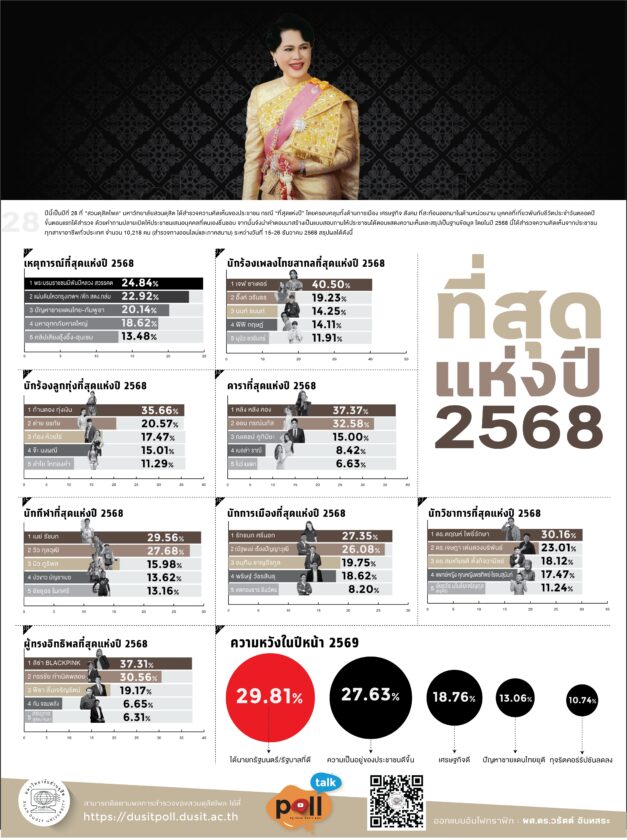 สวนดุสิตโพลเผย “ที่สุดแห่งปี 2568” สะท้อนสังคมไทยท่ามกลางความสูญเสีย–ความหวัง คนไทยอยากได้รัฐบาลที่ดีในปี 2569