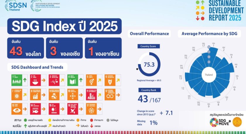 ในมิติการพัฒนาที่ยั่งยืน (SDGs) ไทยอยู่ในอันดับที่ 43 ของโลก และเป็นอันดับ 1 ของอาเซียนในภาพรวม อย่างไรก็ตาม ยังมีประเด็นที่อยู่ใน “โซนสีแดง” หรือยังไม่ผ่านเกณฑ์สำคัญ ได้แก่ ทรัพยากรทางทะเล (SDG 14) ทรัพยากรบนบก (SDG 15) และธรรมาภิบาลหรือการคอร์รัปชัน (SDG 16)