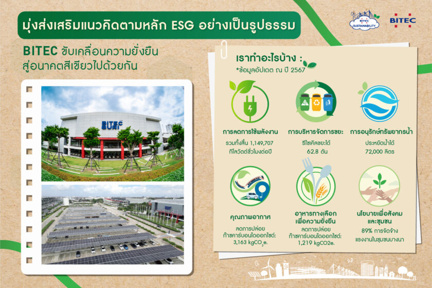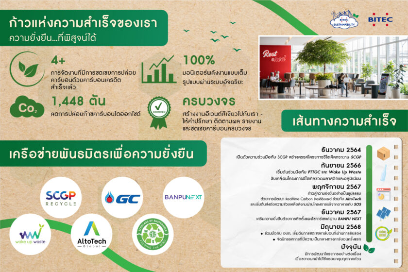 ศูนย์นิทรรศการและการประชุมไบเทค (BITEC) เดินหน้าตอกย้ำบทบาท ผู้นำด้าน Green MICE ด้วยการผนึกกำลัง 6 พันธมิตร ได้แก่ SCGP, PTTGC, Wake Up Waste, AltoTech, Banpu NEXT และ Scholars of Sustenance (SOS) พัฒนา โมเดลจัดงานที่เป็นกลางทางคาร์บอน (Carbon-Neutral Events) ครอบคลุมการ วัด – ลด – ชดเชย การปล่อยก๊าซเรือนกระจก พร้อมนำ เทคโนโลยี Real-Time Carbon Tracking Dashboard และมาตรฐานการชดเชยคาร์บอนของ TGO มาใช้จริง เพื่อผลักดัน อุตสาหกรรมไมซ์ไทยให้เติบโตอย่างยั่งยืน