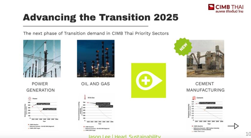 CIMB Thai ประเมินโอกาสการระดมทุนเพื่อการเปลี่ยนผ่านใน 3 เซกเตอร์หลักไว้ที่ประมาณ 30,000 ล้านบาท ภายใน 2 ปีข้างหน้า และตั้งเป้าเพิ่มสัดส่วนสินเชื่อเพื่อความยั่งยืนจาก 4% เป็น 20% ของพอร์ตสินเชื่อทั้งหมดภายในปี 2030