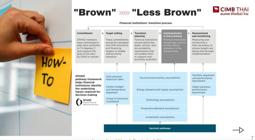 จากแนวคิดนี้ CIMB Thai จึงนำเสนอกรอบ “Brown to Less Brown” แทนการคาดหวังให้ทุกธุรกิจต้องเป็น Green 100% ในทันที โดยยอมรับความจริงว่าอุตสาหกรรมบางประเภท เช่น พลังงานฟอสซิล หรือปูนซีเมนต์ มีข้อจำกัดเชิงโครงสร้างตาม DNA ของธุรกิจ