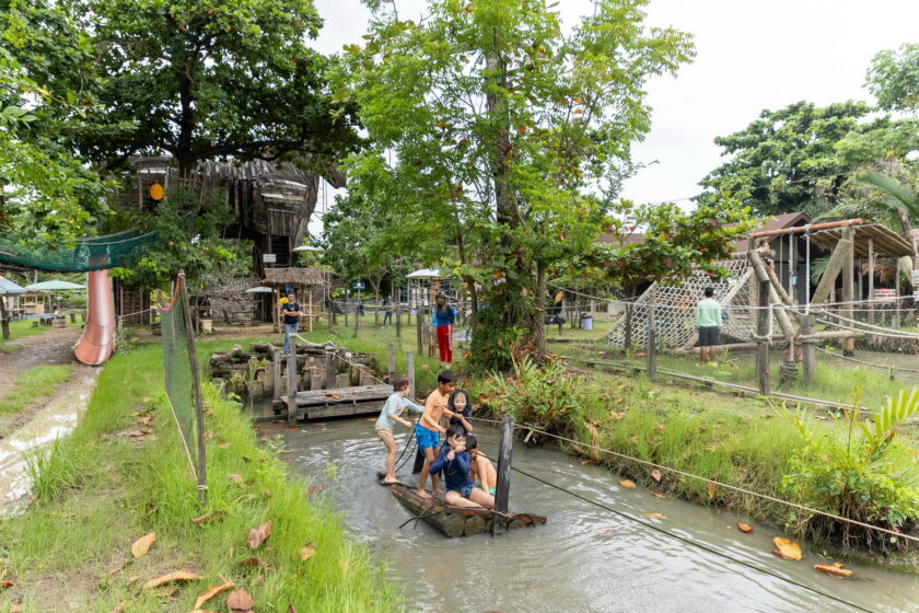 วัสดุที่ใช้ในสนามเด็กเล่นเน้น Circular Design เช่น ไม้เก่า ถังน้ำมันรีไซเคิล เชือกจากเรือ — ทุกอย่างสะท้อนแนวคิดการอยู่ร่วมกับธรรมชาติอย่างยั่งยืน