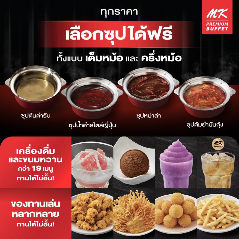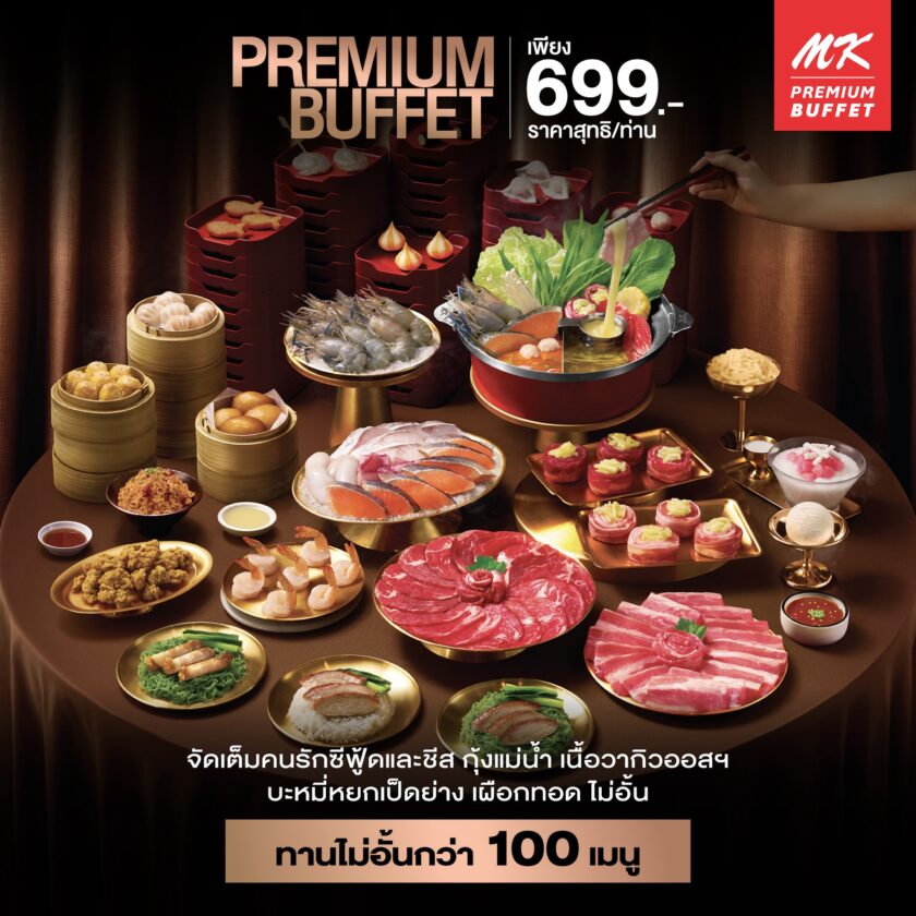 - Premium Buffet 699 บาท → เพิ่มวัตถุดิบพรีเมียมและชีสไม่อั้น บะหมี่หยกเป็ดย่าง ข้าวหน้าเป็ดย่างเอ็มเค เมนูสุกี้ พร้อมเสิรฟ เนื้อวากิวออสเตรเลีย หมูคุโรบุตะพรีเมียม พร้อมพาเหรดซีฟู้ด และชีสไม่อั้น ทั้งกุ้งแม่น้ำนำเข้า เนื้อนำเข้าห่อชีส ติ่มซำทอดสุดฮิต