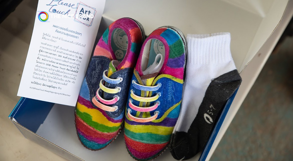 ธนาคารยูโอบี ประเทศไทย ชวนน้องๆ จากโรงเรียนสอนคนตาบอด 11 แห่งทั่วประเทศต่อยอดโครงการ UOB Please Touch หรือ โครงการกรุณาสัมผัส โดยธนาคารยูโอบี สร้างสรรค์รองเท้ากีฬาคู่พิเศษที่มีเพียงคู่เดียวในโลก ร่วมกับพี่ๆ อาสายูโอบี 132 คน สร้างงานศิลปะบนผืนรองเท้าผ้าใบ เพื่อนำส่งต่อให้น้องๆ ที่ขาดแคลนได้สวมใส่ออกกำลังกาย เล่นกีฬา และวิ่งเล่นได้อย่างอิสระปลอดภัย โดยยูโอบี ได้มอบกล่องศิลปะ UOB Please Touch Art Box ให้แก่นักเรียนที่มีความบกพร่องด้านการเห็นมากกว่า 600 คนในโรงเรียนสอนคนตาบอด 11 แห่งทั่วประเทศ เพื่อให้นักเรียนสามารถใช้เครื่องมือและอุปกรณ์ศิลปะในการสร้างสรรค์ผลงานจากจินตนาการทั้งในห้องเรียนวิชาศิลปะที่โรงเรียนและที่บ้าน